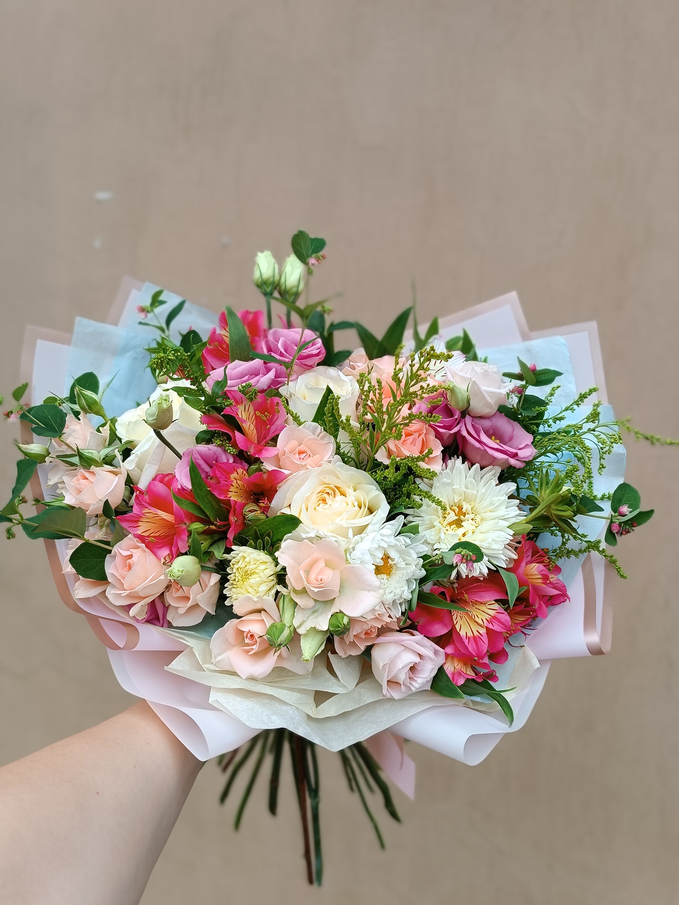 Средние букетыНежно- розовый букет ( розы, хризантема, эвкалипт, гвоздика, альстромерия)2200 руб.